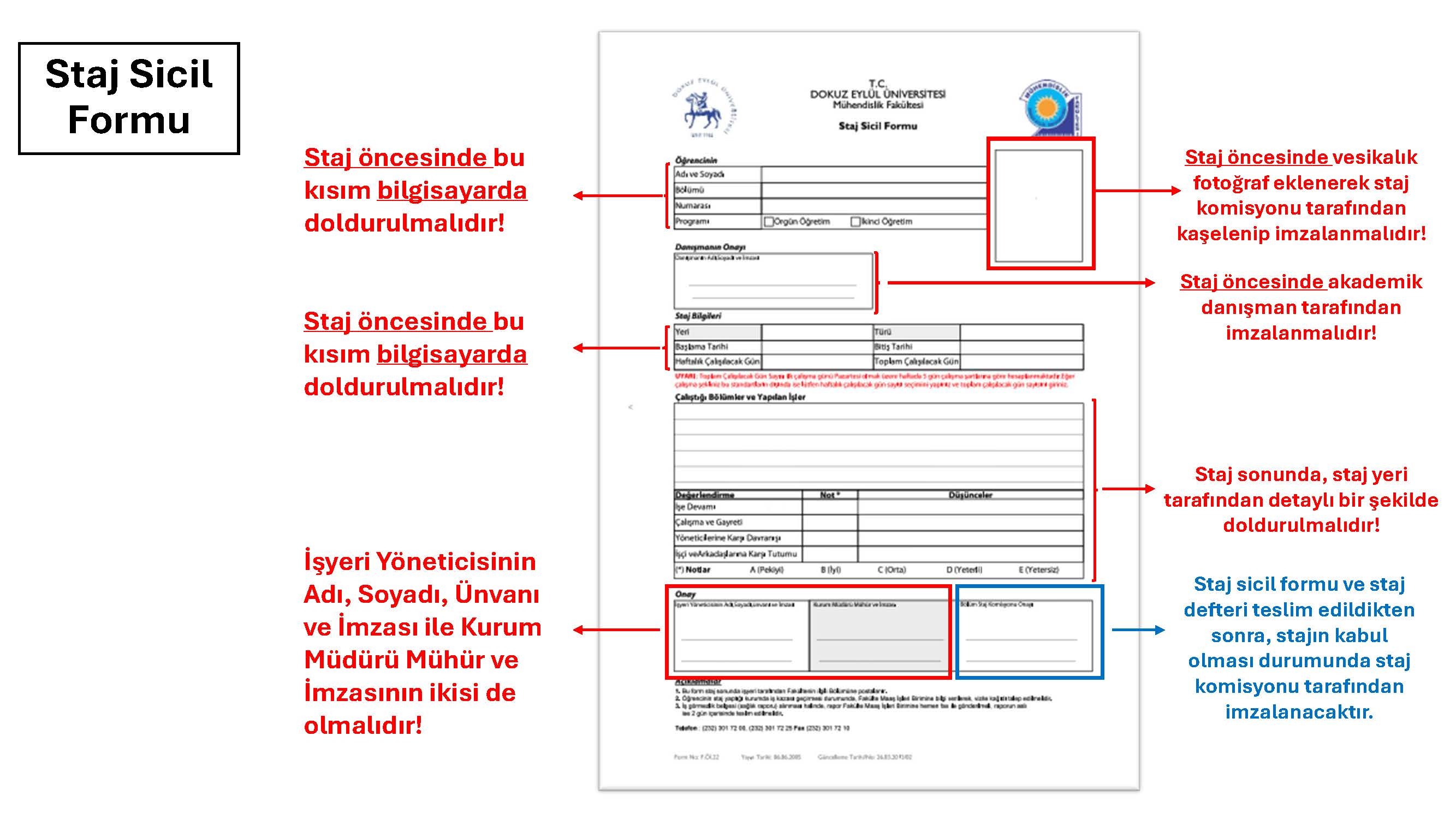 doldurulacaktır. İlk kısmına kişisel bilgiler yazılacaktır. Daha sonra işyeri bilgileri yazılacak ve işyerine onaylattırılacaktır (Bunun için işyerine gidilmesi gerekiyor tekrardan). Son halini almış form, Bölüm Staj Komisyonu tarafından ilan edilen tarihlerde (genellikle finallerden önceki hafta oluyor) komisyona teslim edilecektir. Bu belge ile Dekanlık tarafından öğrencinin sigorta girişi yapılacaktır.